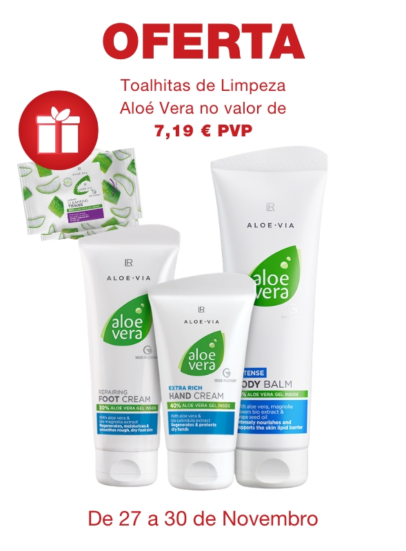 20865 Bálsamo corporal extra nutritivo XXL | 250 ml + 20613 Creme de mãos extra nutritivo | 75 ml + 27517 Creme reparador para os pés | 100 ml Descobre o set de cuidados corporais com aloé vera – a solução perfeita para uma pele bem cuidada! Este set contém três produtos de alta qualidade. enriquecidos com o poder natural da aloé vera. Bálsamo corporal: mima o teu corpo com o nosso bálsamo corporal nutritivo. que penetra profundamente na pele e hidrata-a intensamente. A sua textura leve é rapidamente absorvida e deixa a pele suave. Creme para as mãos extra rico: protege e cuida das tuas mãos com o nosso creme para as mãos extra rico. É rapidamente absorvido e proporciona hidratação duradoura. mesmo em peles secas e castigadas. Ideal para uso diário! Creme reparador para os pés: Dá aos teus pés a atenção que eles merecem! O nosso creme reparador para os pés ajuda a regenerar a pele seca e gretada e dá-te uma sensação de frescura e cuidado. Com este set de cuidados corporais com aloé vera. transformas a tua rotina diária de cuidados numa experiência relaxante e carinhosa. Perfeito para todos os que adoram cuidados naturais!