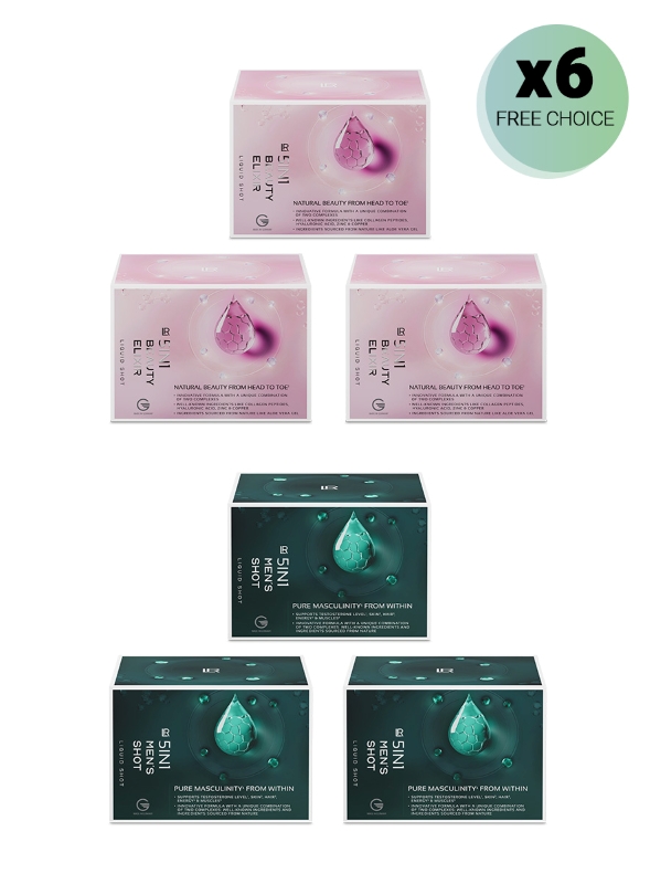 Elixir de Beleza 5 em 1: Água. gel de aloé vera (Barbadensis Miller). xarope de agave. hidrolisado de colagénio. concentrado de sumo de uva branca. concentrado de sumo de laranja (5.4 (%)). concentrado de sumo de pêra. acidificante: ácido cítrico; concentrado de sumo de alperce. concentrado de sumo de pêra. acidificante: ácido cítrico; concentrado de sumo de alperce. carbonato de magnésio. aromas naturais. vitamina C. hialuronato de sódio. conservante: sorbato de potássio; espessante: xantano; Niacina. vitamina E. vitamina A. extrato de raiz de rosa. gluconato de zinco. extrato de laranja sanguínea. extrato de mirtilo. bioflavonoides cítricos. gluconato de cobre. vitamina B6. riboflavina. tiamina. biotina. vitamina B12 Mens Shot 5 em 1: Água. gel de aloé vera (Barbadensis Miller). xarope de agave. hidrolisado de colagénio. acidificante: ácido cítrico; concentrado de sumo de romã (5.3 (%)). carbonato de magnésio. vitamina C. concentrado de sumo de groselha preta (0.7 (%)). extrato de ginseng. L-leucina. L-valina. L-isoleucina. vitamina E. vitamina A. aromas naturais. gluconato de zinco. conservante: sorbato de potássio; espessante: xantano; niacina. selenito de sódio. vitamina B12. biotina. vitamina D. vitamina B6. tiamina. riboflavina. gluconato de cobre. sulfato de manganês.
