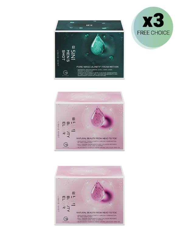Elixir de Beleza 5 em 1: Água. gel de aloé vera (Barbadensis Miller). xarope de agave. hidrolisado de colagénio. concentrado de sumo de uva branca. concentrado de sumo de laranja (5.4 (%)). concentrado de sumo de pêra. acidificante: ácido cítrico; concentrado de sumo de alperce. concentrado de sumo de pêra. acidificante: ácido cítrico; concentrado de sumo de alperce. carbonato de magnésio. aromas naturais. vitamina C. hialuronato de sódio. conservante: sorbato de potássio; espessante: xantano; Niacina. vitamina E. vitamina A. extrato de raiz de rosa. gluconato de zinco. extrato de laranja sanguínea. extrato de mirtilo. bioflavonoides cítricos. gluconato de cobre. vitamina B6. riboflavina. tiamina. biotina. vitamina B12 Mens Shot 5 em 1: Água. gel de aloé vera (Barbadensis Miller). xarope de agave. hidrolisado de colagénio. acidificante: ácido cítrico; concentrado de sumo de romã (5.3 (%)). carbonato de magnésio. vitamina C. concentrado de sumo de groselha preta (0.7 (%)). extrato de ginseng. L-leucina. L-valina. L-isoleucina. vitamina E. vitamina A. aromas naturais. gluconato de zinco. conservante: sorbato de potássio; espessante: xantano; niacina. selenito de sódio. vitamina B12. biotina. vitamina D. vitamina B6. tiamina. riboflavina. gluconato de cobre. sulfato de manganês.